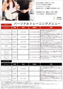 2026/1/8 パーソナルトレーニングのご案内 PRiME fitness & spaでは、豊富なパーソナルトレーニングメニューと、 パーソナルトレーニング専用ルームを完備しております。 ご不明な点がございましたら、スタッフまでお申し付けくださいませ。